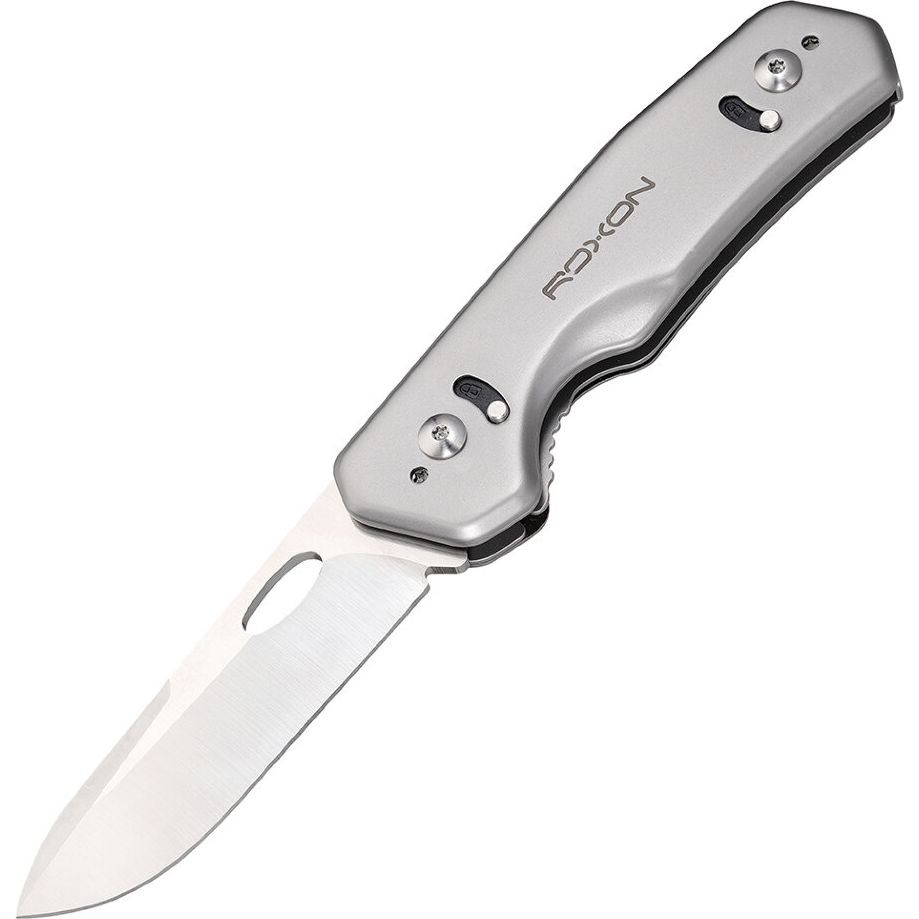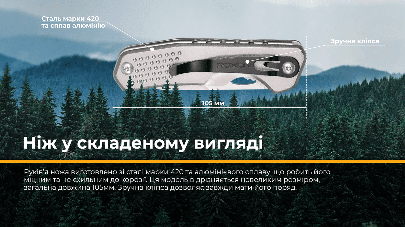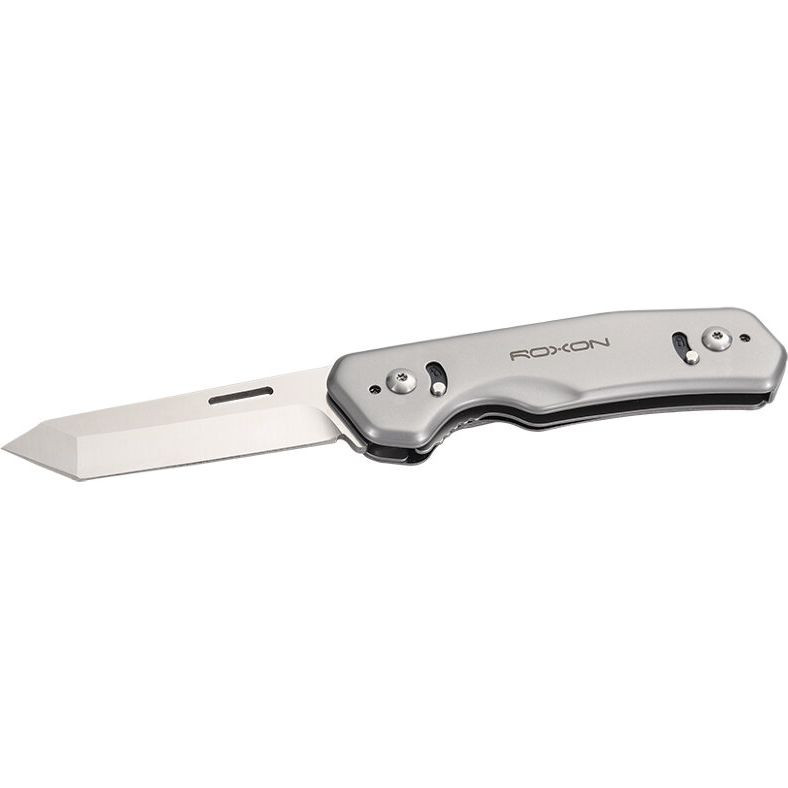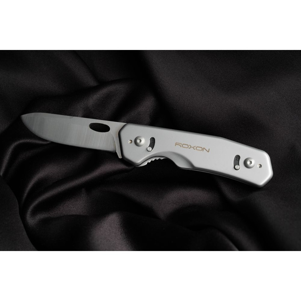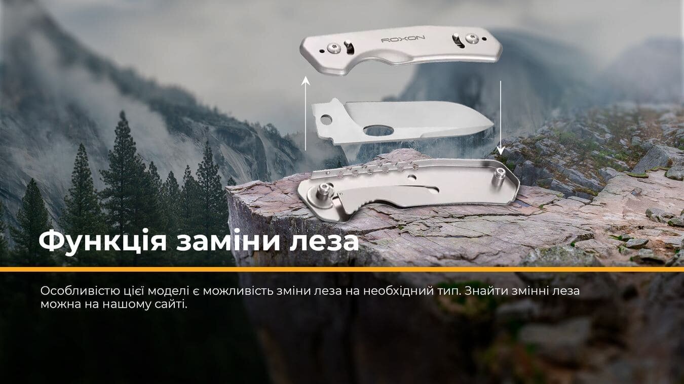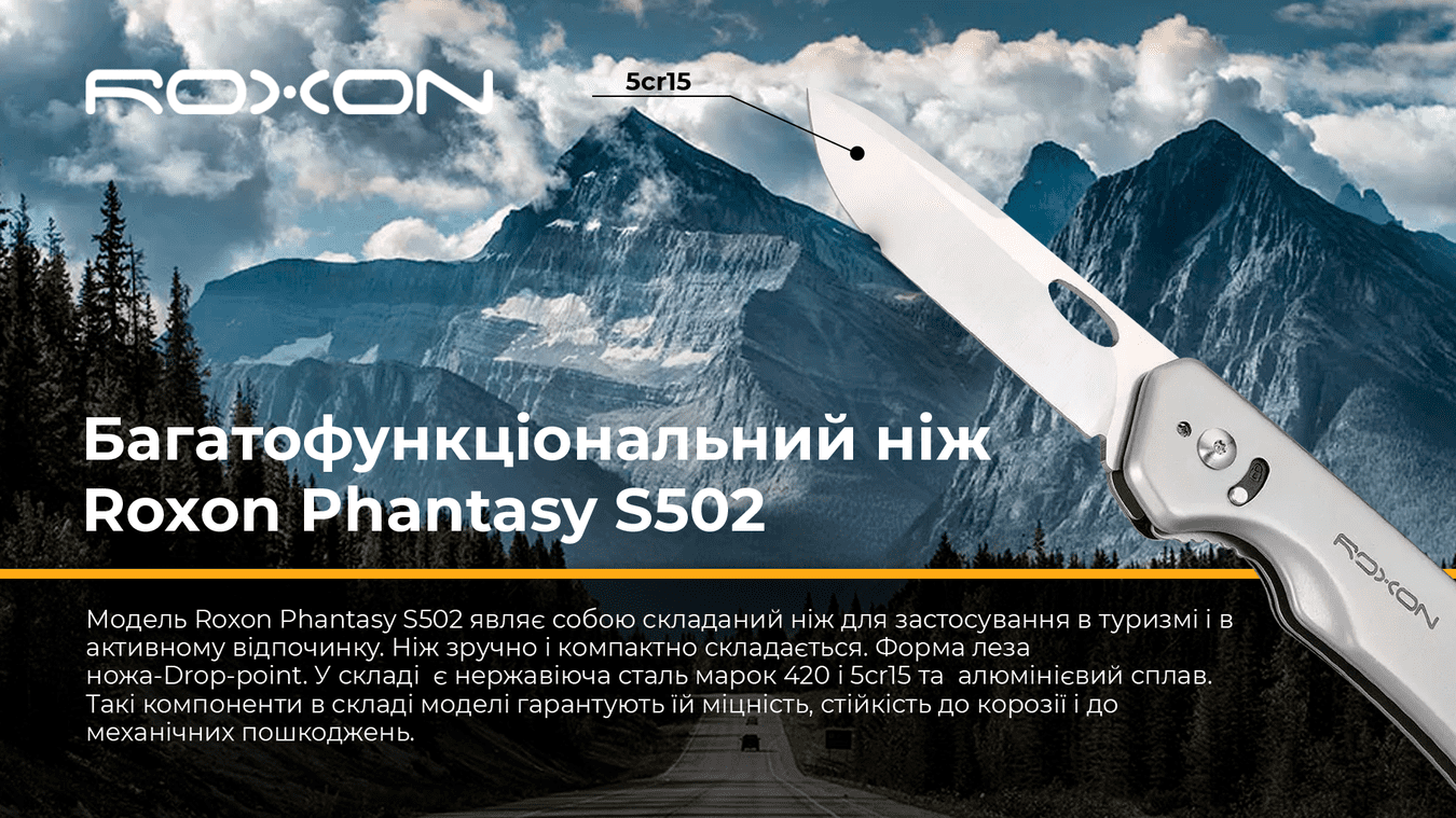 Модель Roxon Phantasy S502 являє собою складаний ніж для застосування в туризмі і в активному відпочинку. Ніж зручно і компактно складається. Прекрасний зовнішній вигляд, гладке поліроване лезо. Є металева кліпса для закріплення ножа і перенесення, можна зафіксувати на кишені, на сумці або на поясі. Потрібний інструмент завжди у вас під рукою. Форма леза ножа-Drop-point, воно може взаємозамінюватися з лезом моделі S802. Є також змінні леза до ножа, щоб можна було виконувати різні операції. Їх слід купувати окремо.