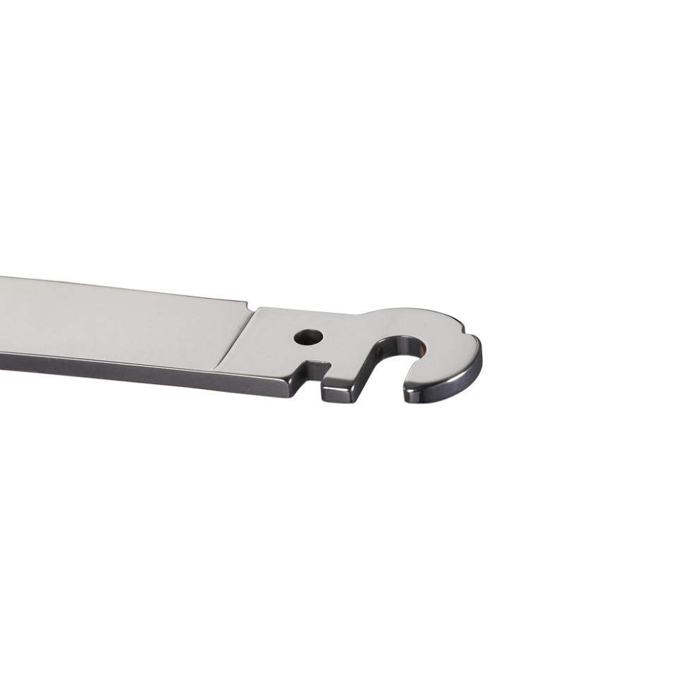 Аксесуар виготовлений зі сталі DIN 1.4116. Марка є нержавіючою, особливо міцною та зносостійкою, тому пряме лезо надовго зберігає гостроту навіть у разі регулярної експлуатації. Ближче до обуха передбачено виїмку для спрощеного виймання клинка.