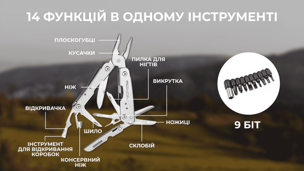 - мультифункціональний інструмент для туризму, активного відпочинку;