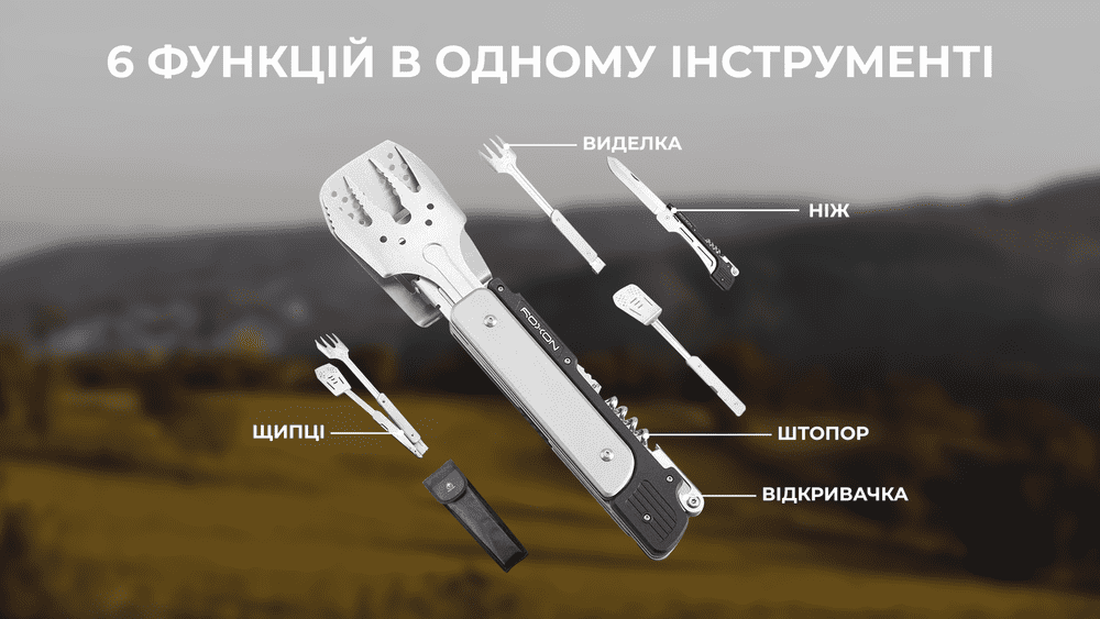 Модель Roxon Multi BBQ Tool призначена для використання на пікніках і під час поїздок в кемпінг. Це повноцінний набір інструментів для приготування будь-яких страв на грилі.