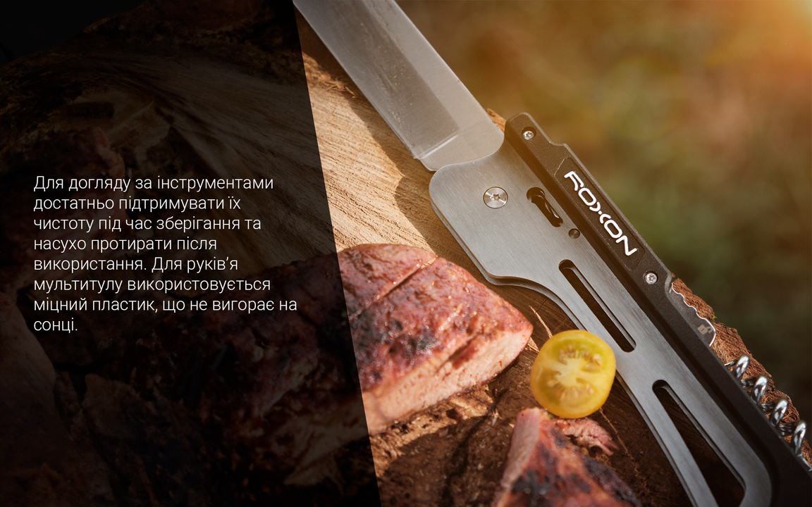 Цей мультиінструмент для барбекю складається з складного ножа, лопатки і вилки. Кожен елемент розроблений таким чином, щоб бути зручним, простим у використанні, невимогливим у догляді. Основним матеріалом для них є сталь 5Cr15Mov. Це сплав з добре вираженою стійкістю до корозії. Він містить невеликий відсоток вуглецю і легований хромом, молібденом, ванадієм.