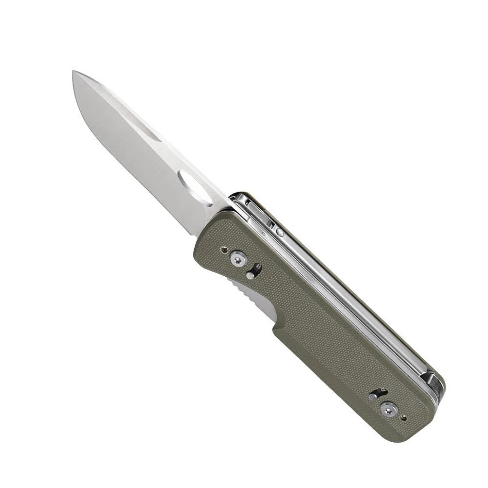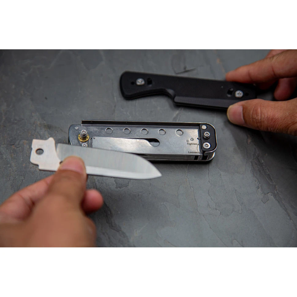 Інструменти виконані з нержавіючих марок сталі 8Cr13MoV, DIN 1.4116 та 3Cr13, які довго тримають заточування та витримують регулярні навантаження без сколів. Накладки G10 на руківʼї демонструють стійкість до вологи, температурних перепадів та хімії, а найголовніше — сприяють міцному хвату внаслідок шорсткої поверхні. Додаткові елементи та вставки виготовлені з ударостійкого ABS-пластику.