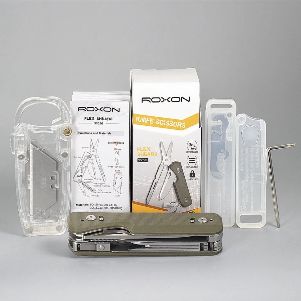 Roxon Flex S505G — це повноформатний мультитул, що виконує 14 функцій. У конструкції об'єднані переваги лінійки FLEX та системи Phantom Blade System, що дозволяє змінювати набір функцій під свої завдання — від повсякденного EDC носіння до виконання професійної роботи.