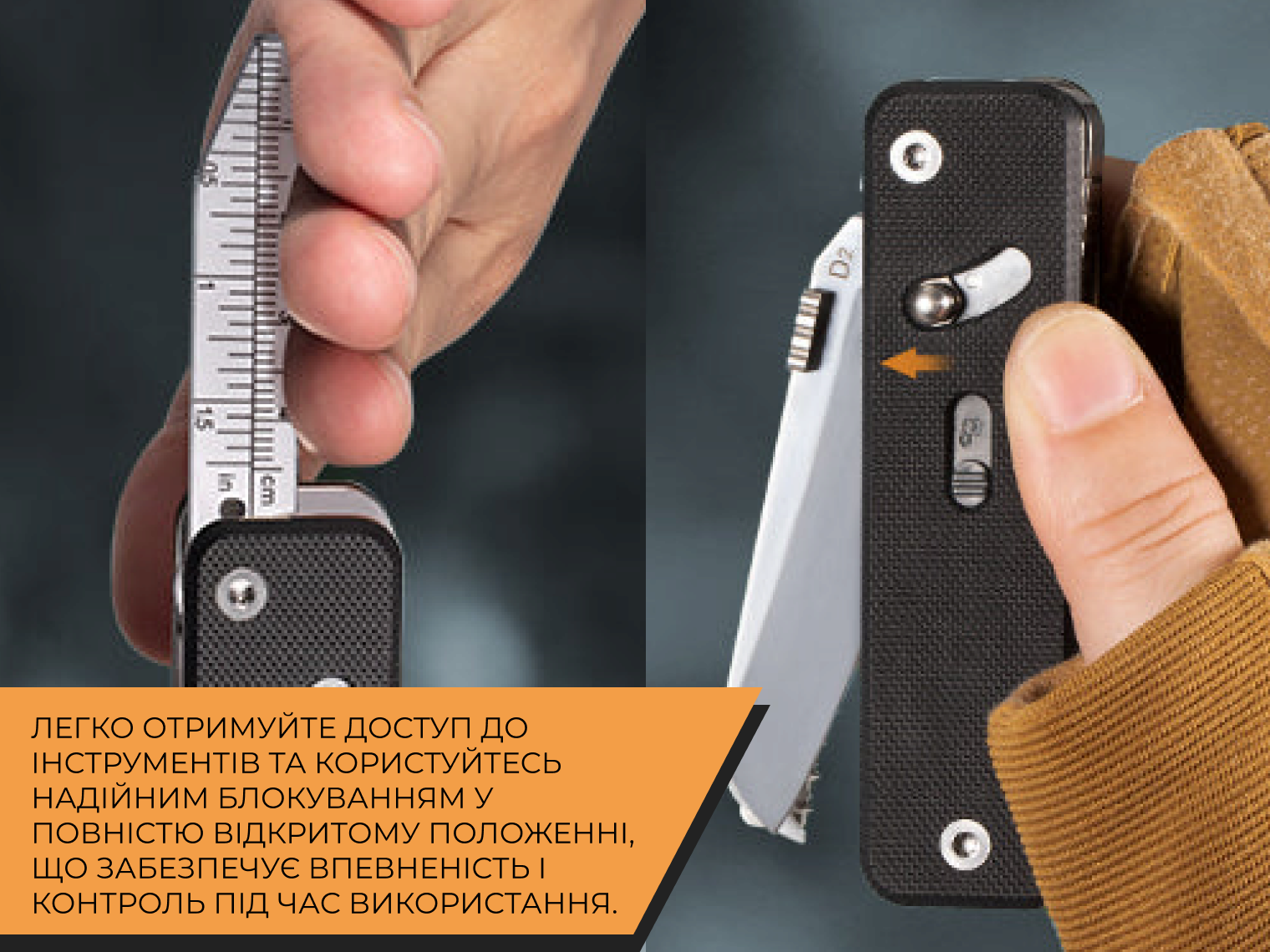 Інструменти фіксуються при повному розкритті, запобігаючи мимовільному закриттю елемента під час використання. Основний ніж можна відкривати однією рукою за допомогою шпеника під великий палець з боку клинка.