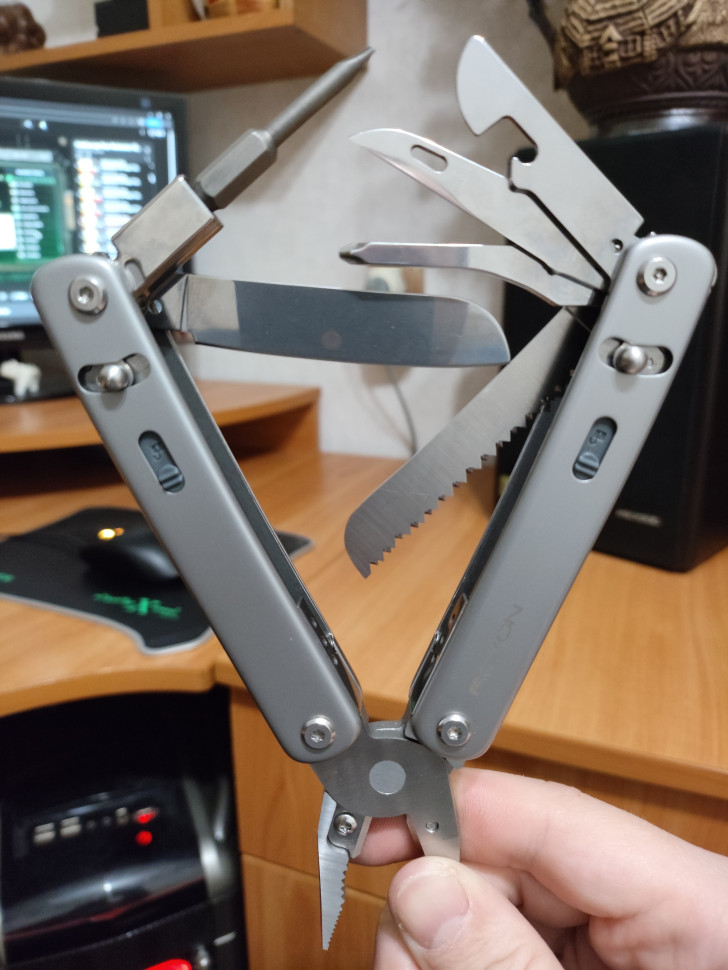 Мультитул був придбаний у оф. продавця на алі, бо тут ще був не доспупний. Весь час пролежав на поличці. Вперше дістав, щоб зняти ізоляцію з провода розетки, а плоскогубці взяли і тріснули. Якість дуже погана, а реклама гарна).