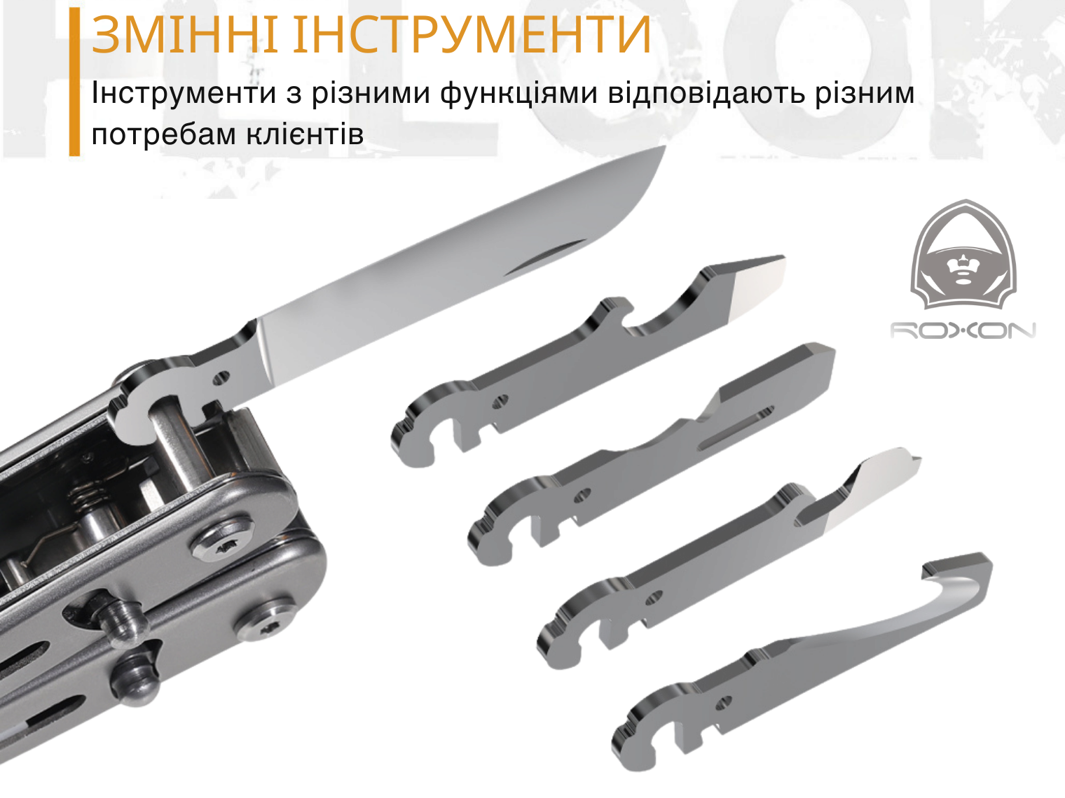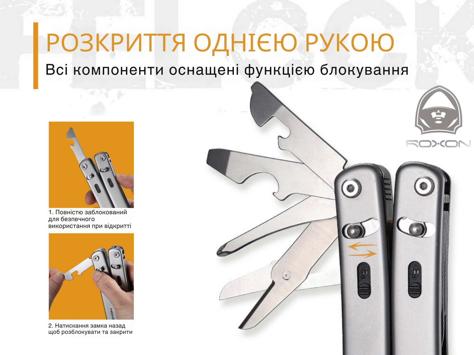 Функціонал можна доповнити 32 змінними інструментами, що підходять для вирішення певних завдань (комплектуючі купуються окремо). Відкривання мультитула здійснюється одним рухом руки з фіксацією кожного елемента за допомогою системи блокування, яка не дає виробу скластися під час навантаження.