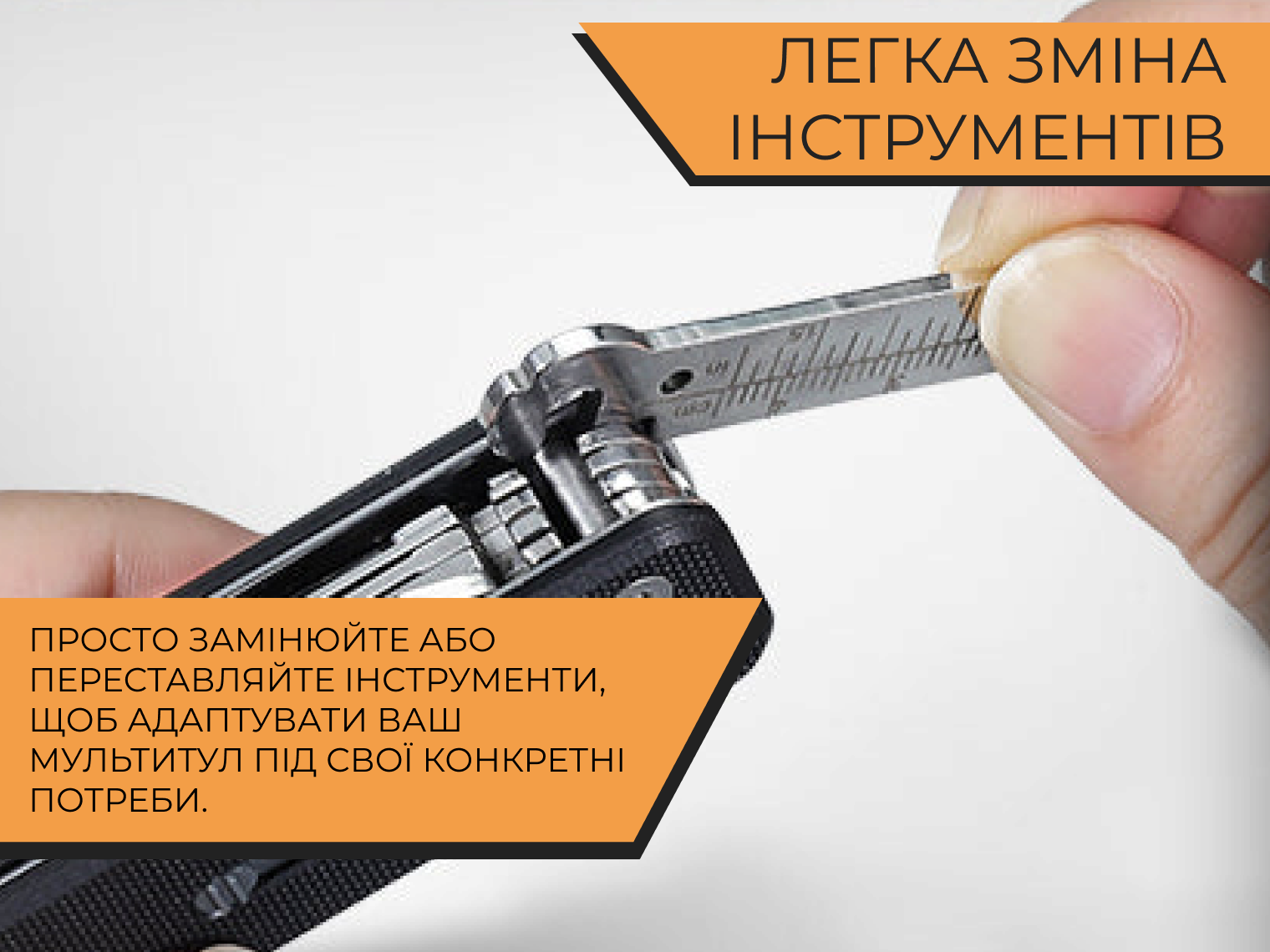 Мультитул має механізм фіксації, який блокує відкриті інструменти та виключає ймовірність випадкового складання під час роботи. Шорстка поверхня руківʼя G10 запобігає ковзанню у руці та гарантує надійний хват навіть при вологій долоні.