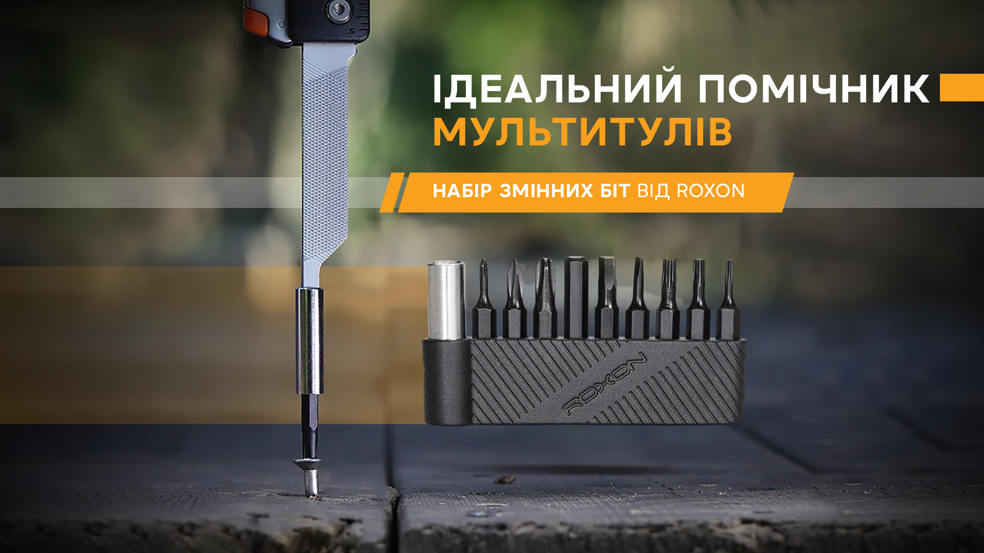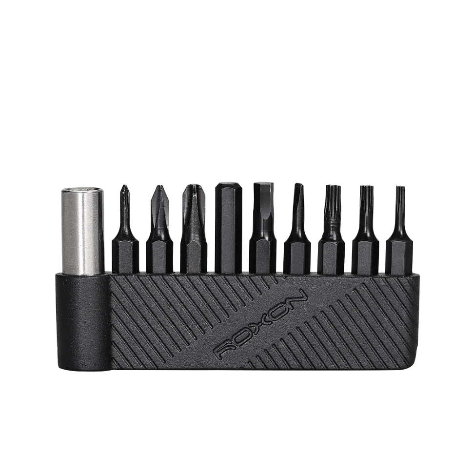 Комплект Roxon включає 9 змінних біт популярних типорозмірів: PH000, PH0, PH2, H3.0, H4.0, T6, T8, T10 і плоска біта 2.0. До набору також входить тримач, який забезпечує надійну фіксацію біти завдяки інтегрованому магніту. Комплект сумісний з рядом фірмових інструментів: міні мультитулами KS2, M2 і M3, повноформатним мультитулом S802 та мультитулом-молотком H1.