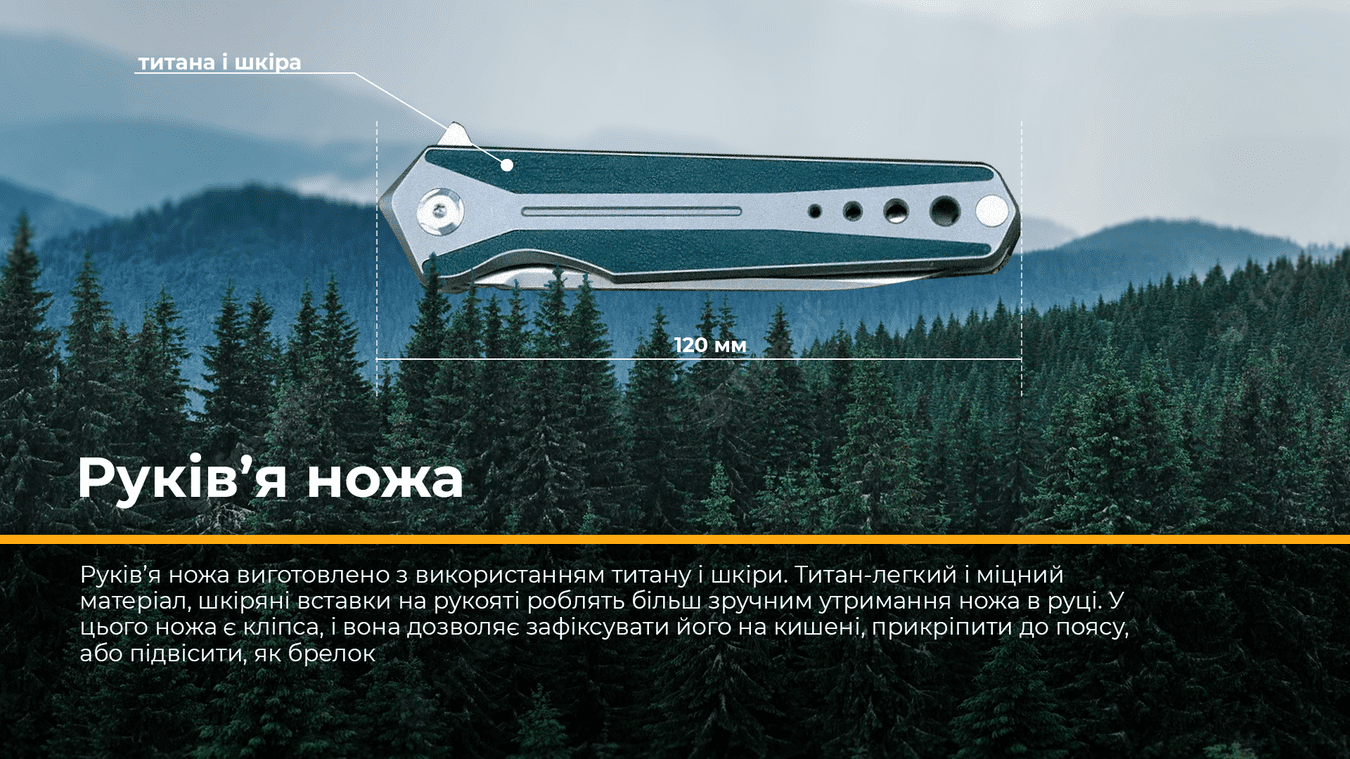 Рукоять ножа виготовлена з використанням титану і шкіри. Титан-легкий і міцний матеріал, шкіряні вставки на рукояті роблять більш зручним утримання ножа в руці. Пам'ятайте про те, що правильний догляд за інструментом допомагає продовжити його термін експлуатації. Шкіра на рукояті чутлива до дії вологості і високих температур. З цієї причини слід оберігати ніж від вологи і нагрівання, тримати його в місцях, добре провітрюваних і сухих, а протирати – м'якою серветкою.