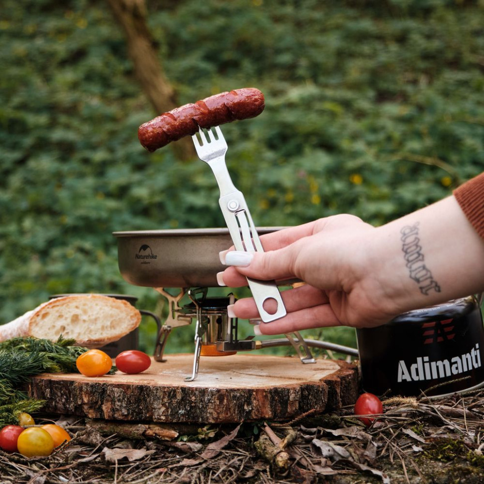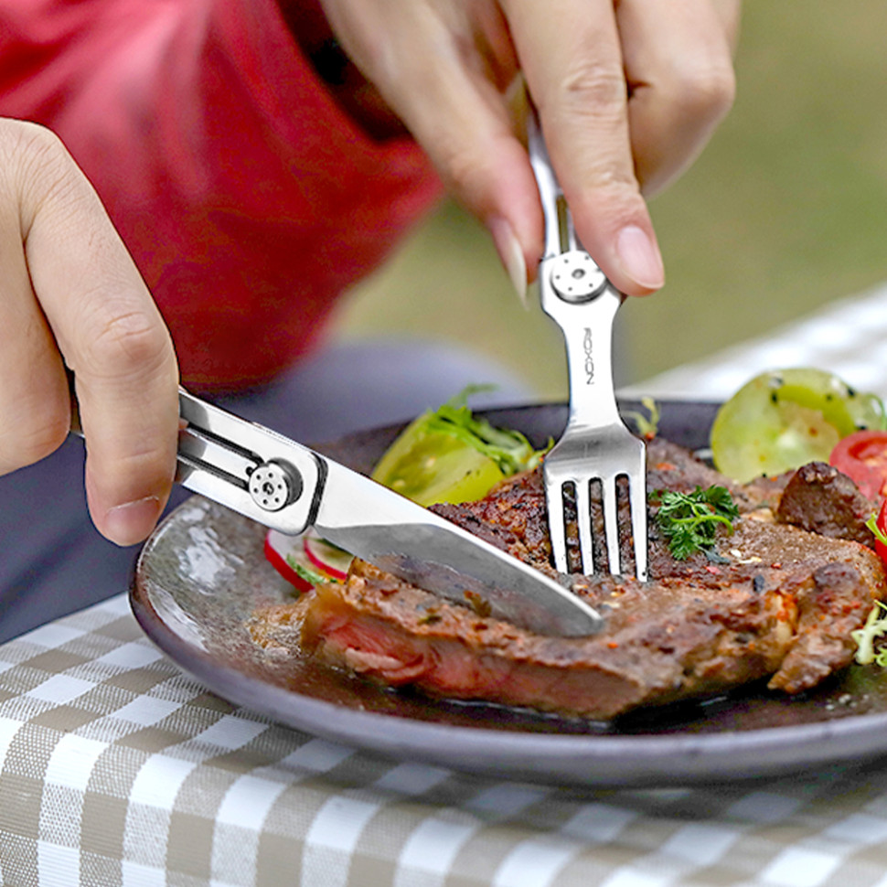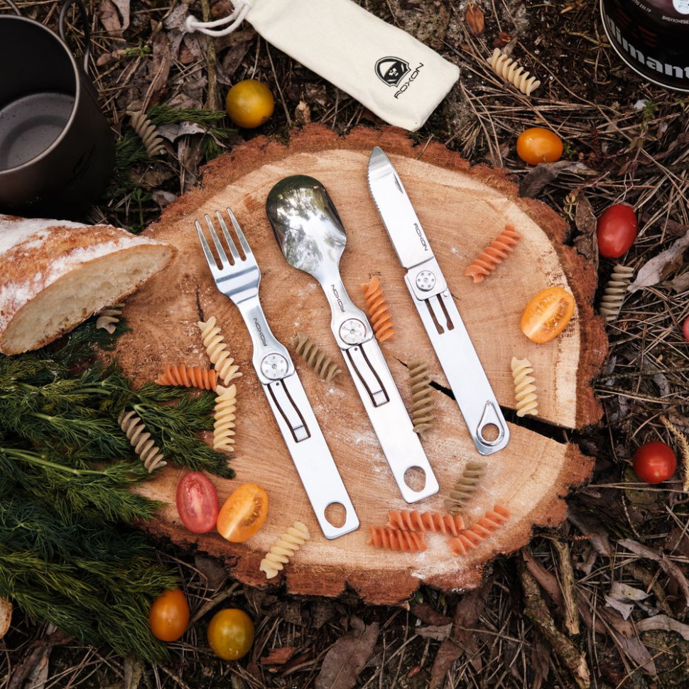 Інструменти мають складану конструкцію, займаючи на 50% менше місця, ніж аналогічні вироби фіксованого формату. Розміри складеного набору дорівнюють 101 х 35 х 27 мм при вазі всього 122 г. В комплекті також є мішечок на зав'язках для зручного зберігання столових приборів та захисту металу від подряпин.
