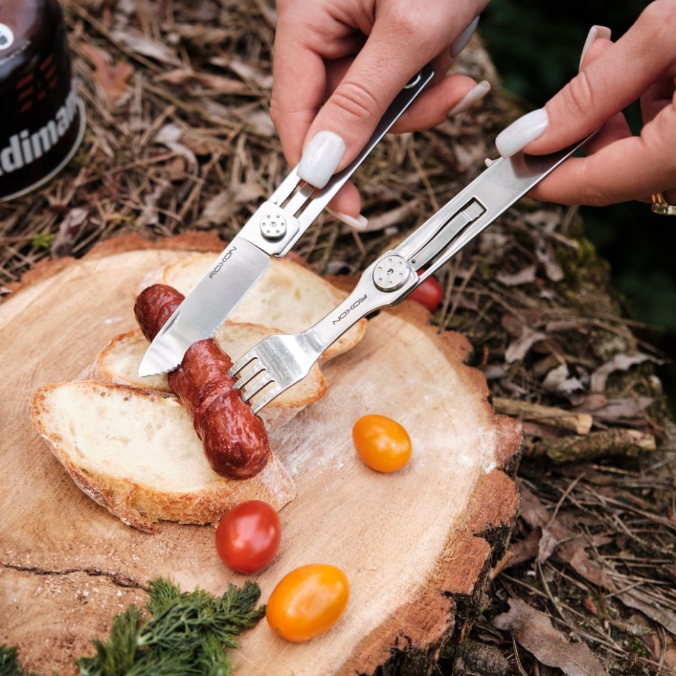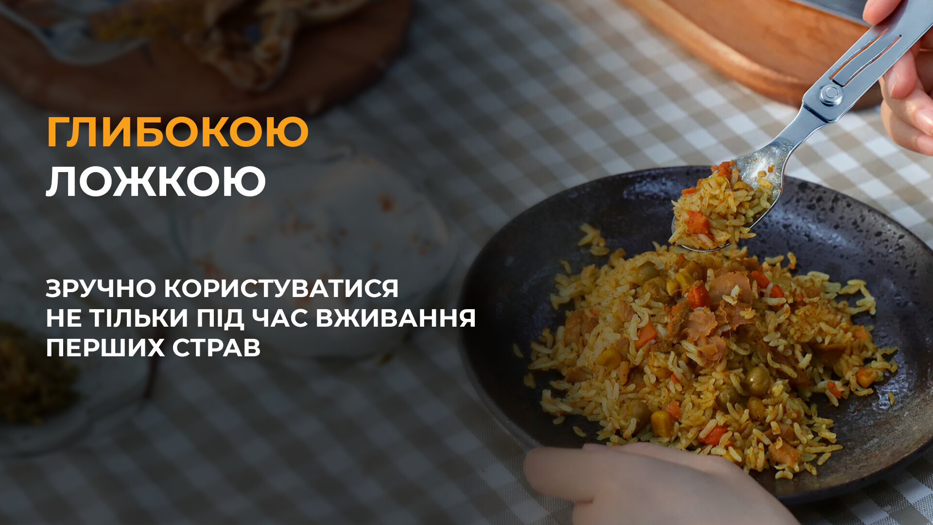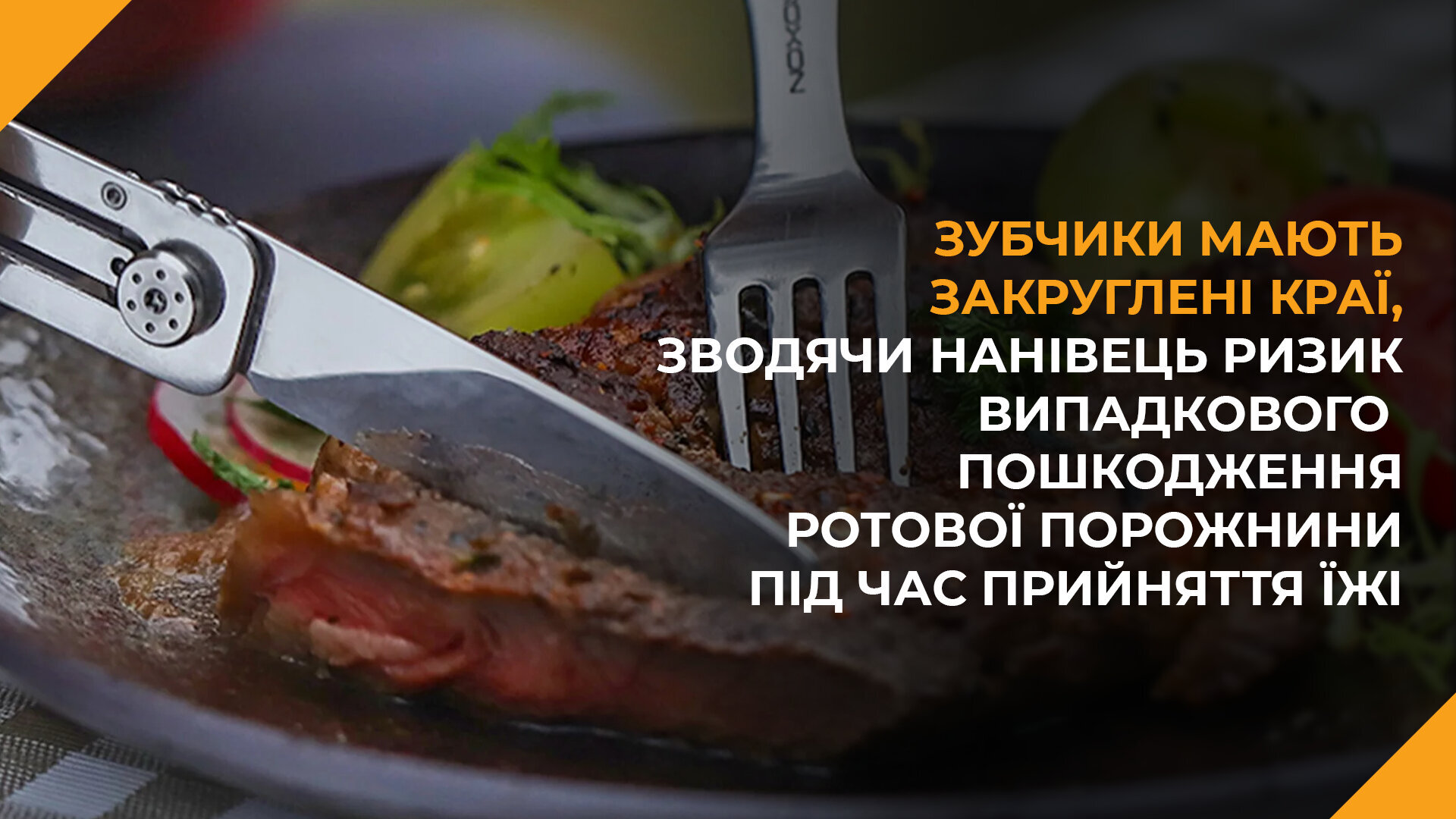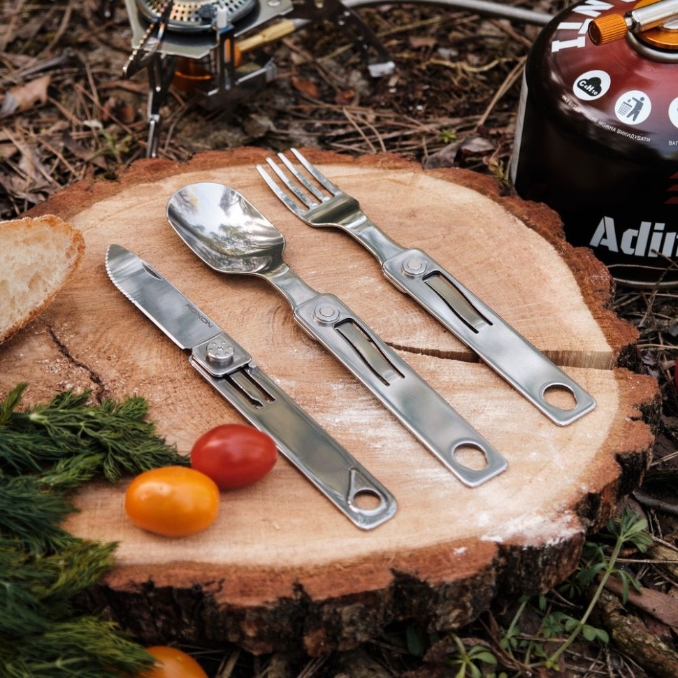 • в комплекті є ложка, виделка та ніж з комбінованим заточуванням;