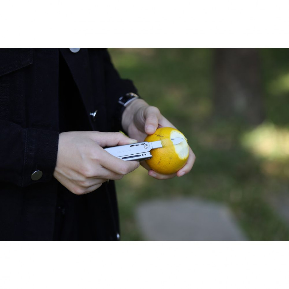 Потужні ножиці можуть перерізати мотузку. В основі інструменту-міцний матеріал, нержавіюча сталь марки 3Cr13, ножиці зручні, гнучкі, добре нарізають. Гострий ніж оптимально підійде для того, щоб, наприклад, почистити шкірку яблука. На природі це буде дуже ДО РЕЧІ. У комплекті разом з мультиінструментом передбачені змінні біти.