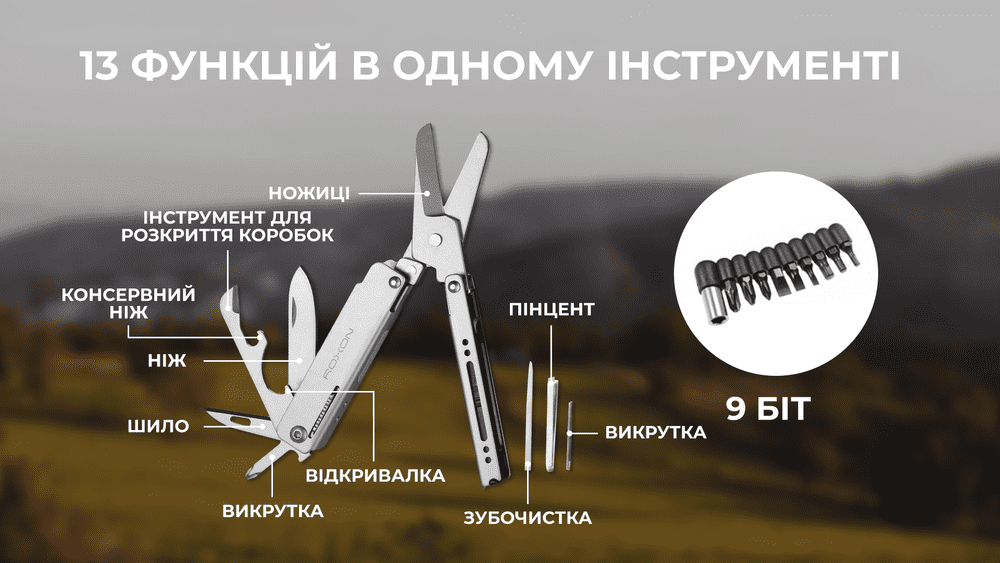 - мультифункціональний інструмент для туризму, активного відпочинку;
