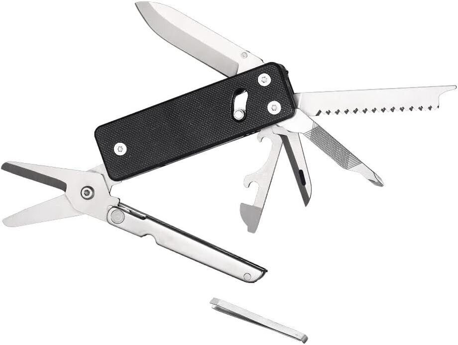- 10 различных функций. Здесь есть классический клинок Drop-Point из высокоуглеродистой стали 5Cr15MoV. Он имеет прямую заточку, за которой легко ухаживать с помощью абразива средней или мелкой зернистости. Функции ножа дополняют мини ножницы, пилочка для ногтей с наконечником в виде крестообразной отвертки, кусачки для ногтей, элемент с открывалками для консервных банок и бутылок, на конце которого присутствует плоская отвертка. С противоположной стороны инструмента с пилочкой есть небольшая линейка. Вспомогательные элементы изготовлены из другой марки стали — 420, которая также входит в число нержавеющих.
