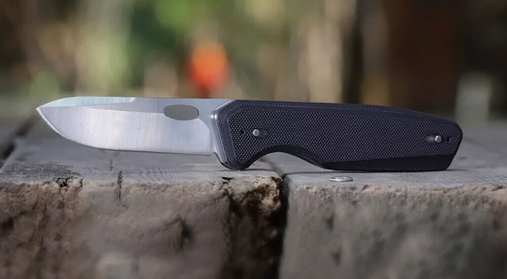 Еще один складной нож, но с более изысканным дизайном. Здесь использована инструментальная сталь D2 в клинке, а рукоять из G10 украшена кожаными вставками.
