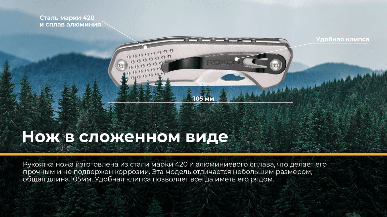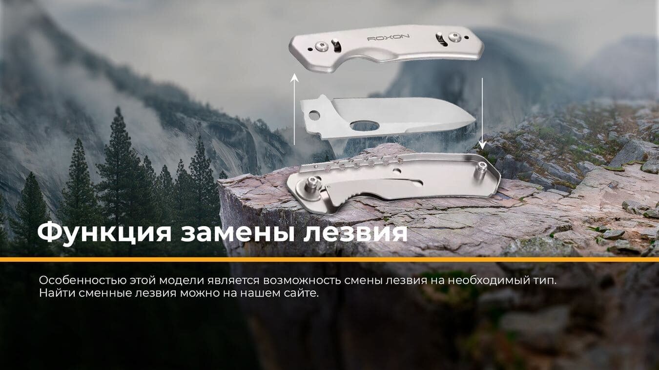 Модель Roxon Phantasy S502 представляет собой складной нож для применения в туризме и в активном отдыхе. Нож удобно и компактно складывается. Прекрасный внешний вид, гладкое полированное лезвие. Есть металлическая клипса для закрепления ножа и переноса, можно зафиксировать на кармане, на сумке либо на поясе. Нужный инструмент всегда у вас под рукой. Форма лезвия ножа – Drop-point, оно может взаимозаменяться с лезвием модели S802. Есть также сменные лезвия к ножу, чтобы можно было выполнять различные операции. Их следует приобретать отдельно.