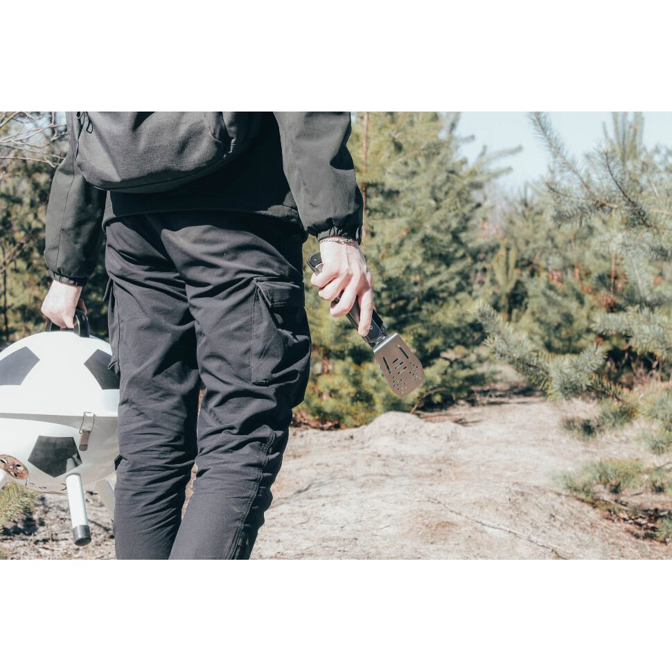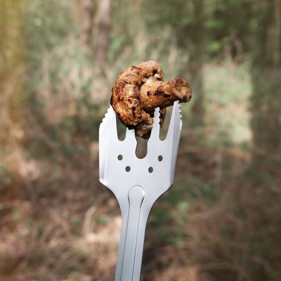 Непосредственно к ножу крепятся лопатка и вилка. Оба инструмента сделаны полностью металлическими, со складной ручкой. У вилки 4 зубчика с зазубринами, чтобы мясо не соскальзывало с нее.