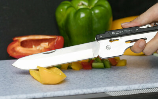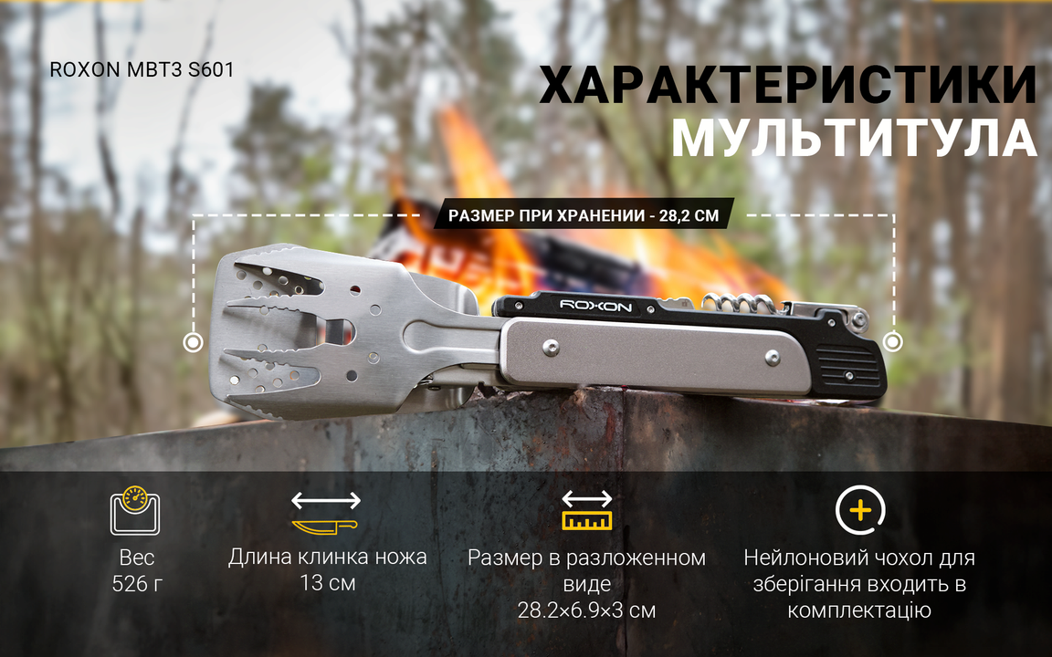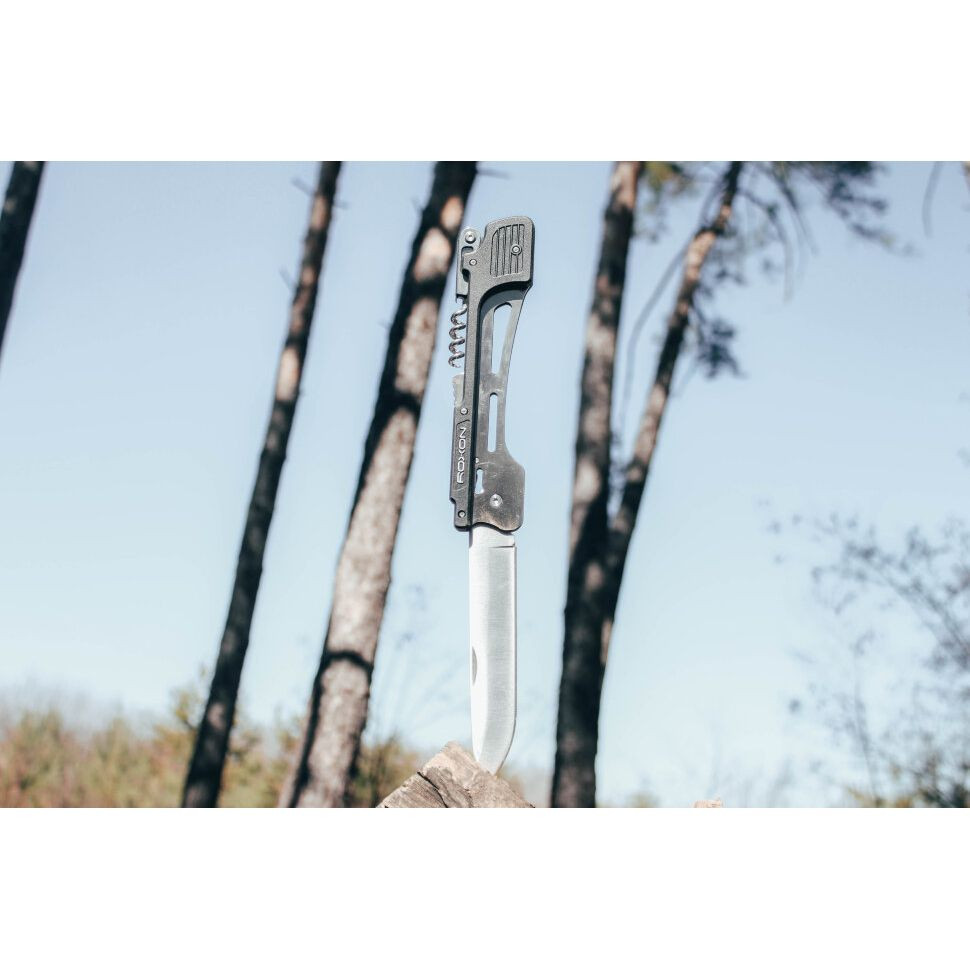 Модель Roxon Multi BBQ Tool наделена еще двумя дополнительными функциями. В рукоятке ножа размещены штопор и открывалка для бутылок. Весь комплект весит 526 г. Для хранения этого мультиинструмента предназначен нейлоновый чехол, который продается с ним в комплекте.
