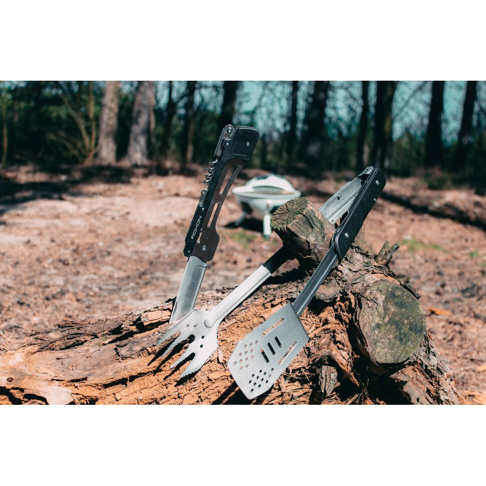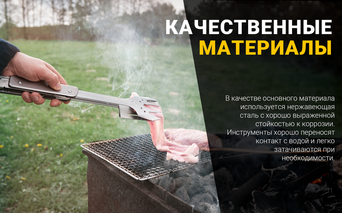 Этот мультиинструмент для барбекю состоит из складного ножа, лопатки и вилки. Каждый элемент разработан таким образом, чтобы быть удобным, простым в использовании, нетребовательным в уходе. Основным материалом для них является сталь 5Cr15MoV. Это сплав с хорошо выраженной стойкостью к коррозии. Он содержит небольшой процент углерода и легирован хромом, молибденом, ванадием.