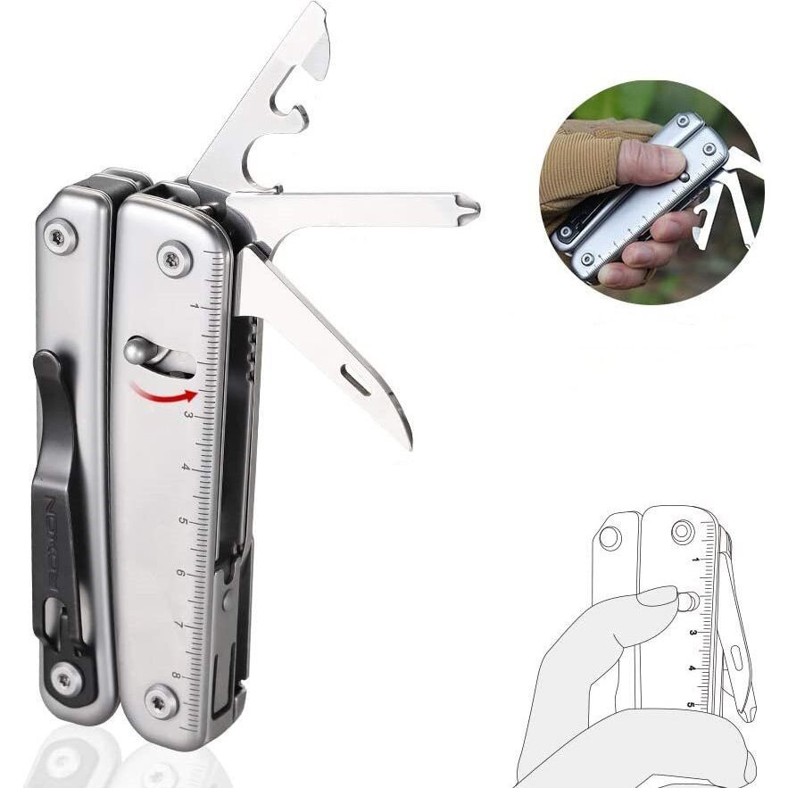 Использовать мультитул можно одной рукой, делать это легко и просто. Вам будет удобно и приятно работать с мультитулом, даже когда руки в перчатках. Инструменты, которыми оснащается модель, действенные на практике. Нож хорошо выполняет такие виды работ, как строгание дерева, перерезание верёвки, а также прочие действия. При создании модели использовали сталь марки 5Cr15MoV, твёрдость которой составляет 55-58 единиц по Роквеллу. Сталь крепкая, и гарантирует острую режущую кромку. Нож безопасен в эксплуатации. Комфортно использовать.