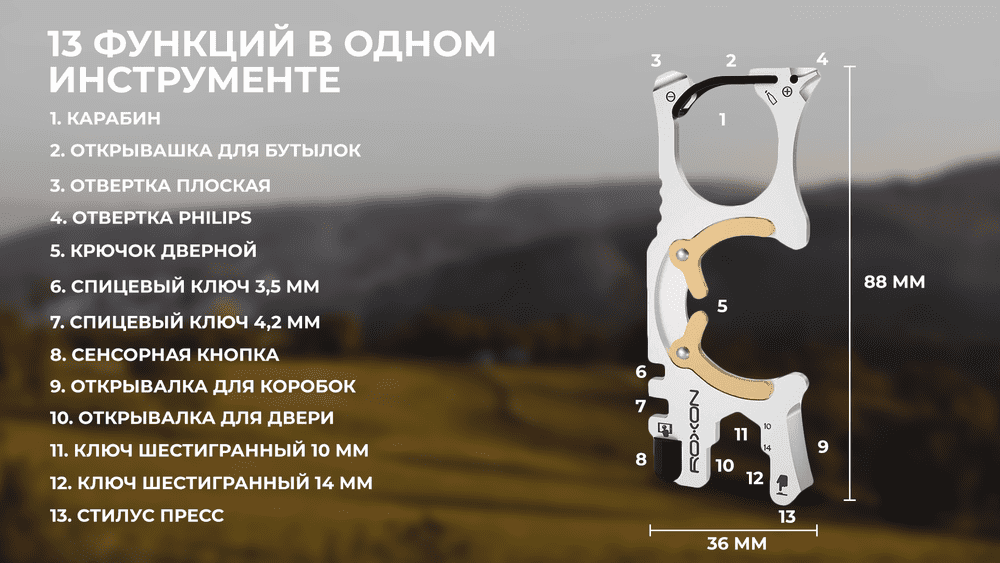 Мультиинструмент чрезвычайно эффективный и функциональный, с помощью него удаётся совершать множество операций. Открывать бутылки, вскрывать коробки, что-либо подкручивать, поворачивать, а также многое иное – легко при использовании мультитула. Он выполнен аккуратным и надёжным, имеет прочную структуру, рассчитан на долгий срок использования. Ровный контур без заусенцев. Эргономичная ручка. Конструкция дуги обеспечивает удобный захват. Задняя часть имеет кольцевую конструкцию, что хорошо для стабильного сцепления пальцев и удобного применения.