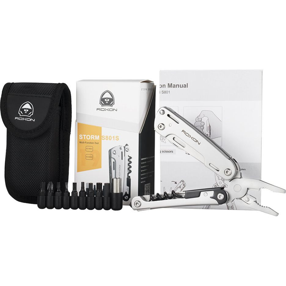 Компания Roxon предлагает свою версию полноразмерного мультитула - STORM S801S. Он рассчитан на 16 функций, но компактно складывается, чтобы поместиться в карман. Продается этот мультитул в комплекте со сменными битами и прочным чехлом.