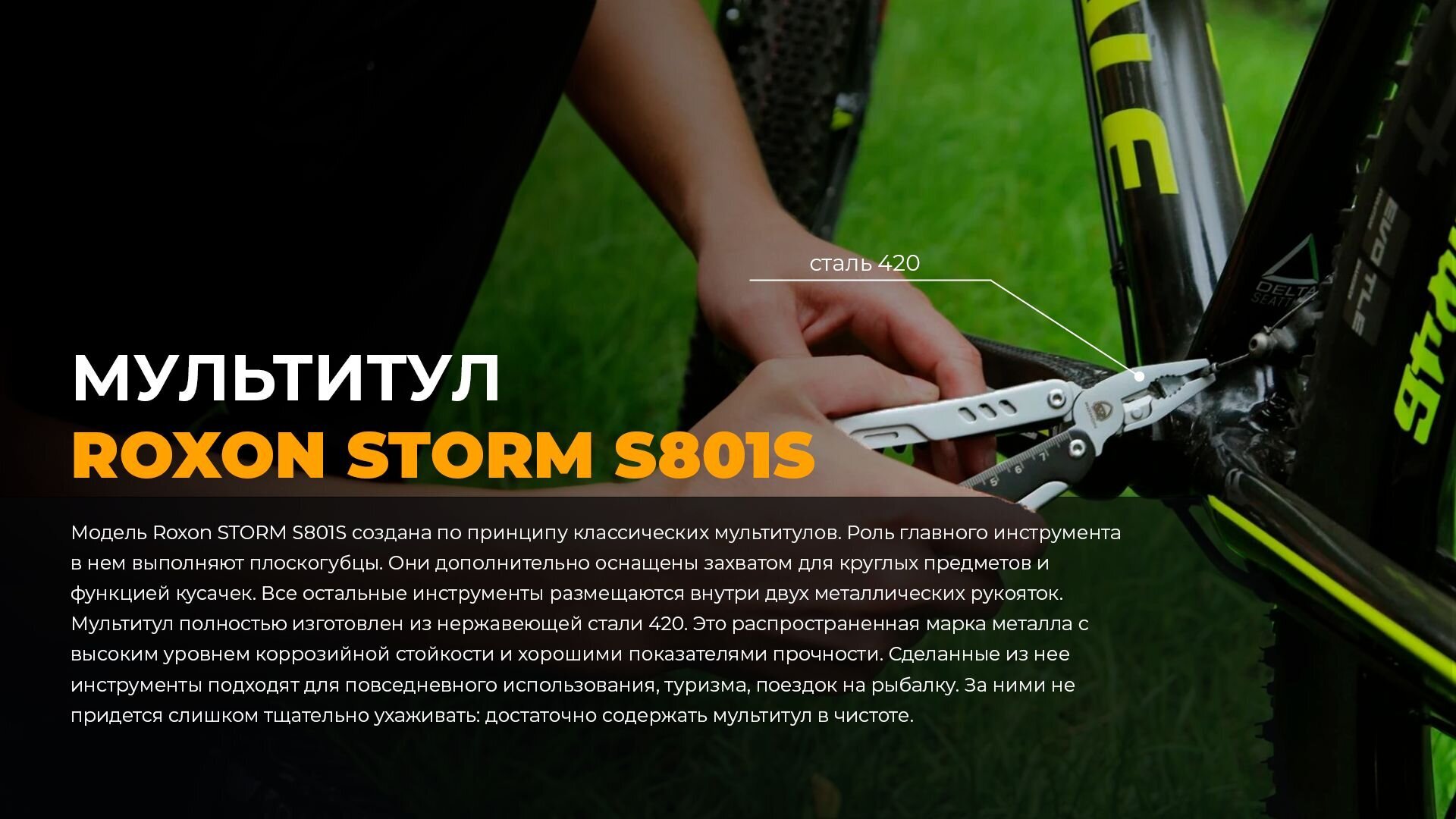 Roxon STORM S801S полностью изготовлен из нержавеющей стали 420. Это распространенная марка металла с высоким уровнем коррозийной стойкости и хорошими показателями прочности. Сделанные из нее инструменты подходят для повседневного использования, туризма, поездок на рыбалку. За ними не придется слишком тщательно ухаживать: достаточно содержать мультитул в чистоте.