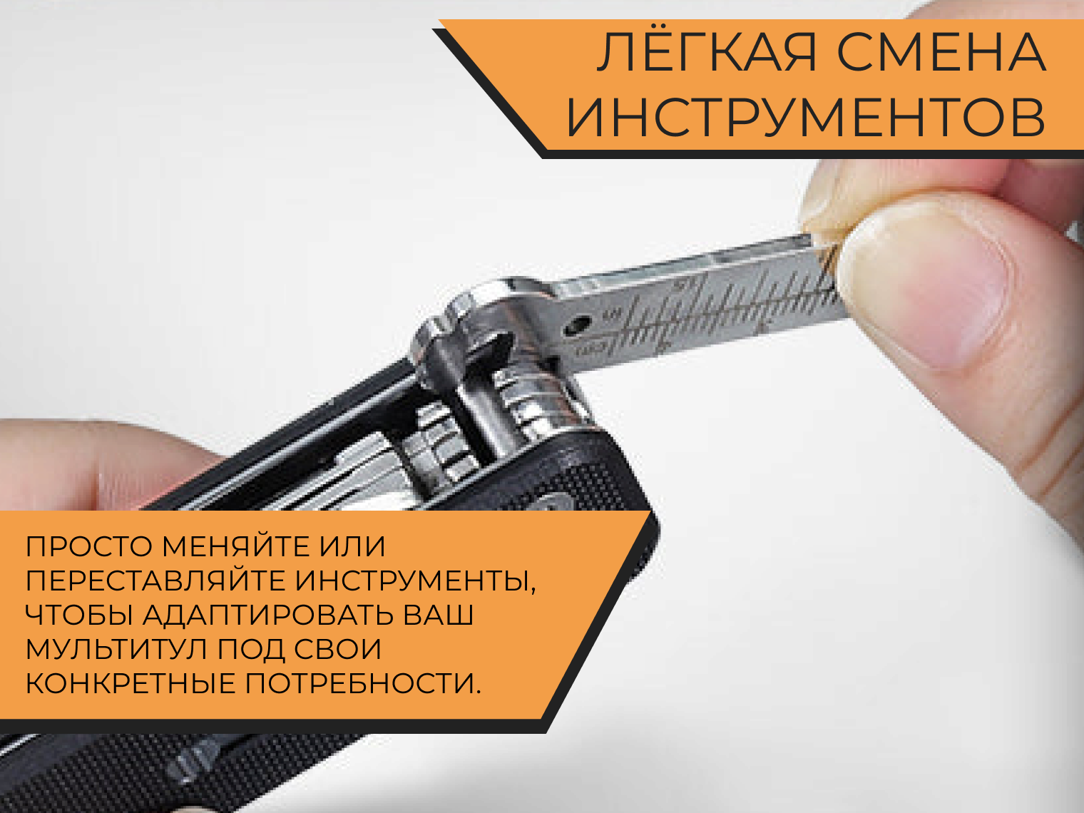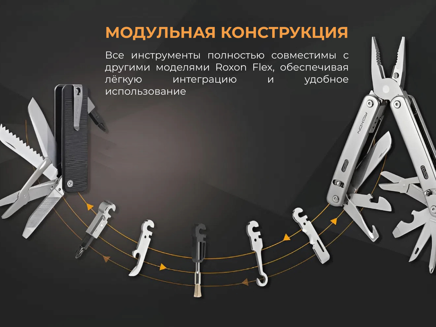 Главное преимущество модели — модульная система. Отдельные элементы можно менять, чтобы собрать собственный набор инструментов и оптимизировать мультитул под личные потребности. Элементы также совместимы с полноформатным мультитулом Roxon Flex (за исключением адаптера для бит 1/4"), что делает Mini Flex Companion частью большой универсальной системы инструментов.