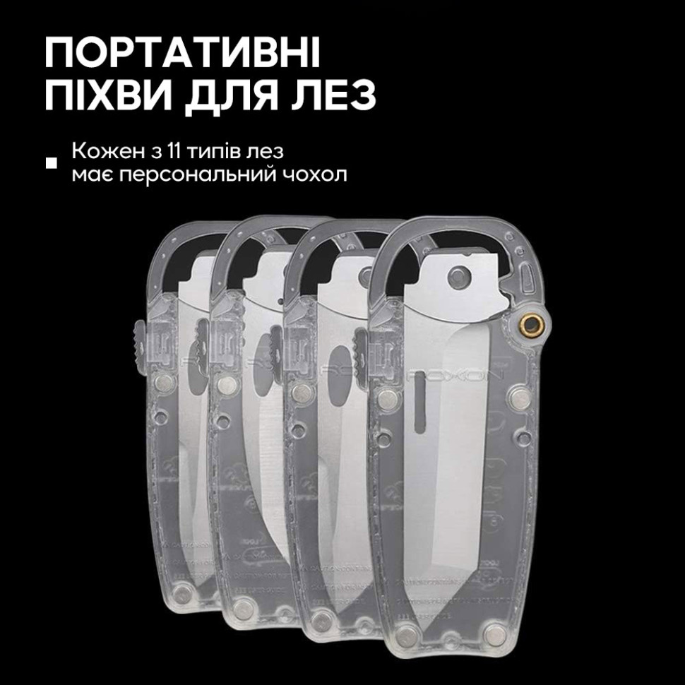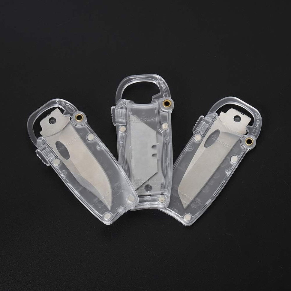 Чтобы хранение клинков было предельно безопасным, производитель поставляет каждый элемент в чехле из прозрачного пластика. Чехлы дополнены блокираторами, что не дает лезвиям случайно выскользнуть во время транспортировки. Габариты упаковки, в которой поставляются три сменных клинка, составляют около 106 х 43 х 22 миллиметров.