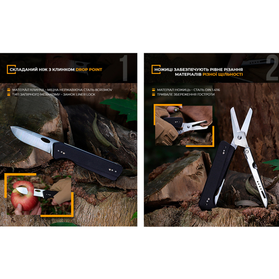 Благодаря использованию нержавеющих марок стали, инструменты эффективно противостоят коррозии и не требуют специального ухода. Клинок изготовлен из стали 8Cr13MoV, а ножницы — из марки DIN 1.4116 немецкого производства. Оба металла выделяются высокой прочностью, длительным сохранением остроты и простотой в заточке, поэтому лезвиям можно легко возвращать остроту без лишних усилий.
