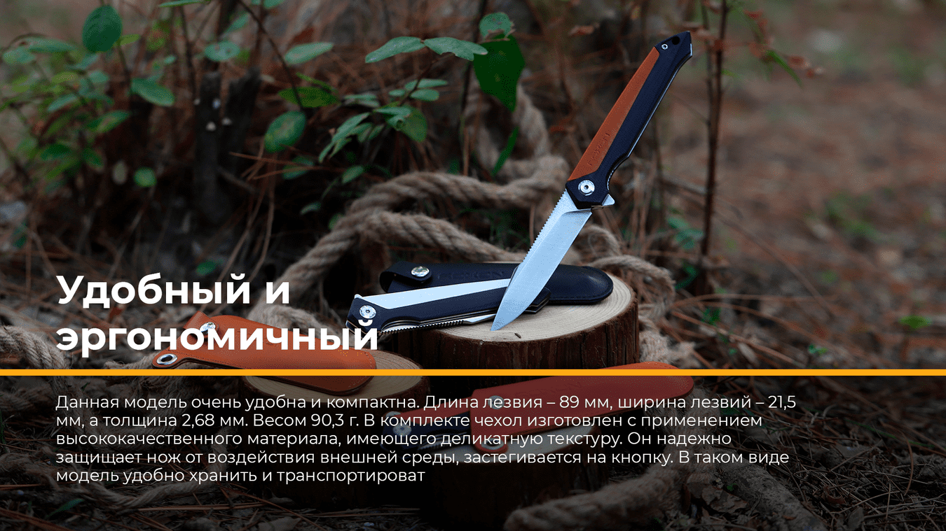 Удобен в хранении и транспортировке. Для этой цели здесь предусмотрена специальная клипса, и посредством её можно закрепить модель на кармане, подвесить к поясу брюк, либо зафиксировать на сумке. Также специально для хранения есть кожаный чехол. Его вы можете подвесить через карабин к поясу брюк, и в таком виде переносить нож. Закрывается чехол на кнопку. Продуманность и комфорт во всём.