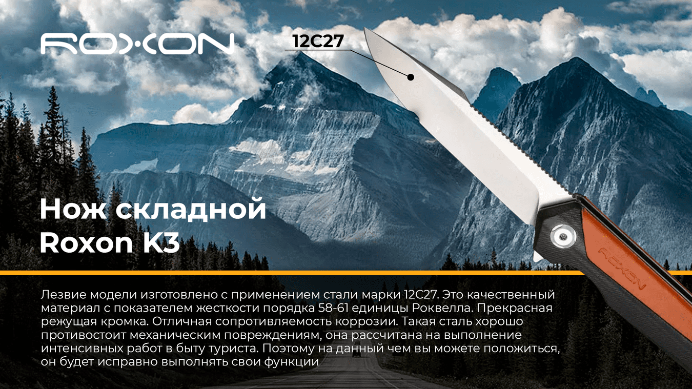Складной нож Roxon K3 является удобным туристическим инструментом, рассчитанным на интенсивное применение. Разные варианты цвета модели – белый, коричневый, оранжевый. Особенность ножа – в наличии характерных насечек на обухе. Удобен в удержании, прост в использовании, открывать и закрывать можно одной рукой. Форма клинка – drop-point, считающаяся универсальной разновидностью. Таким лезвием легко выполнять как колющие, так и режущие, движения. Клинок оптимален для нарезания, выковыривания, очистки, рубки и различных иных операций.