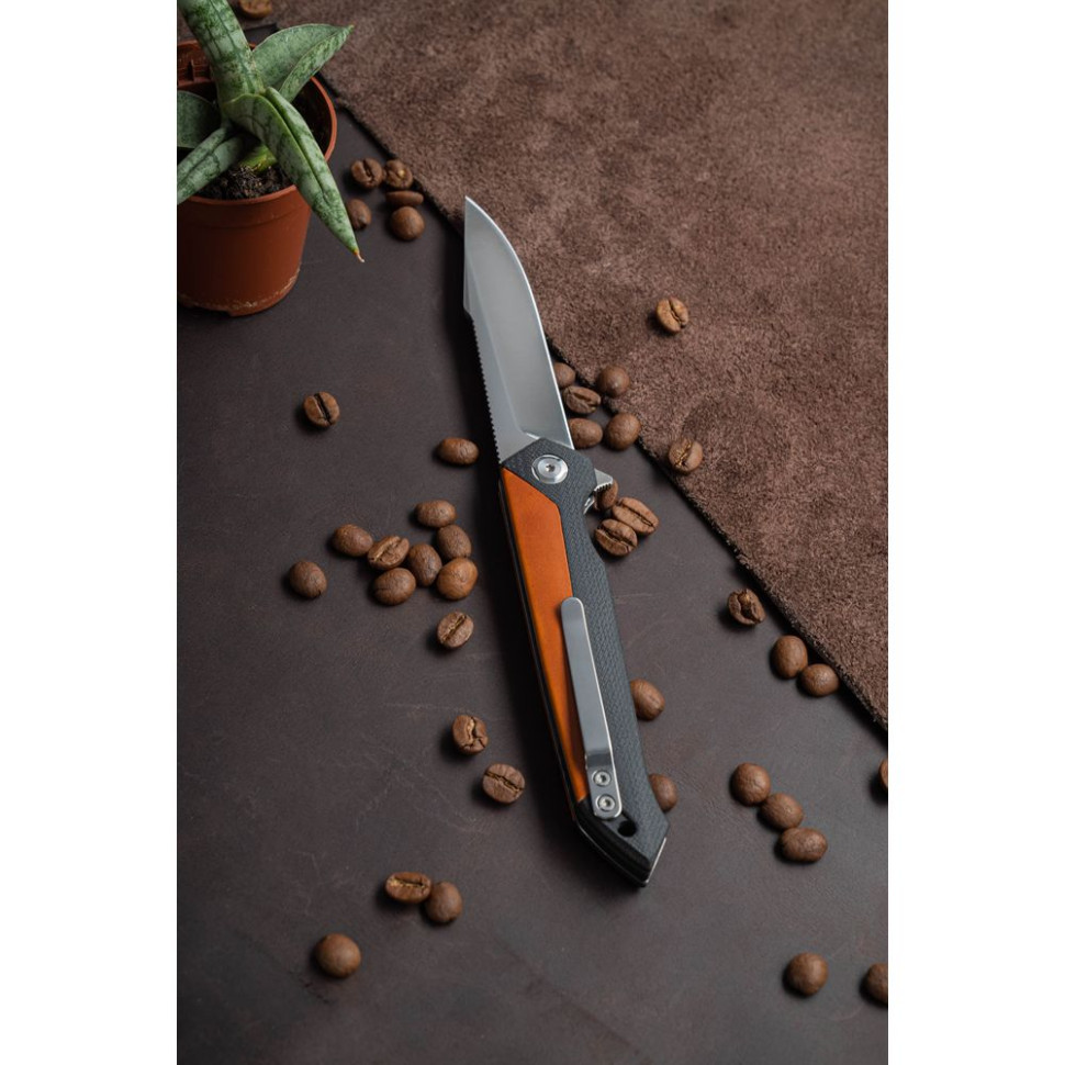 Рукоять ножа изготовлена с использованием стеклотекстолита G10. Данный материал является очень стойким к механическим воздействиям, эффективно противостоит губительному влиянию влаги. Он также хорошо поддаётся окрашиванию. Прочный, способен выдерживать влияние высоких температур. Также в состав рукояти вошла кожа – лёгкая, премиум-класса. Открывается и закрывается безопасно одной рукой. Керамический подшипник обеспечивает плавное открытие и закрытие лезвия. Ножевой механизм – флиппер.