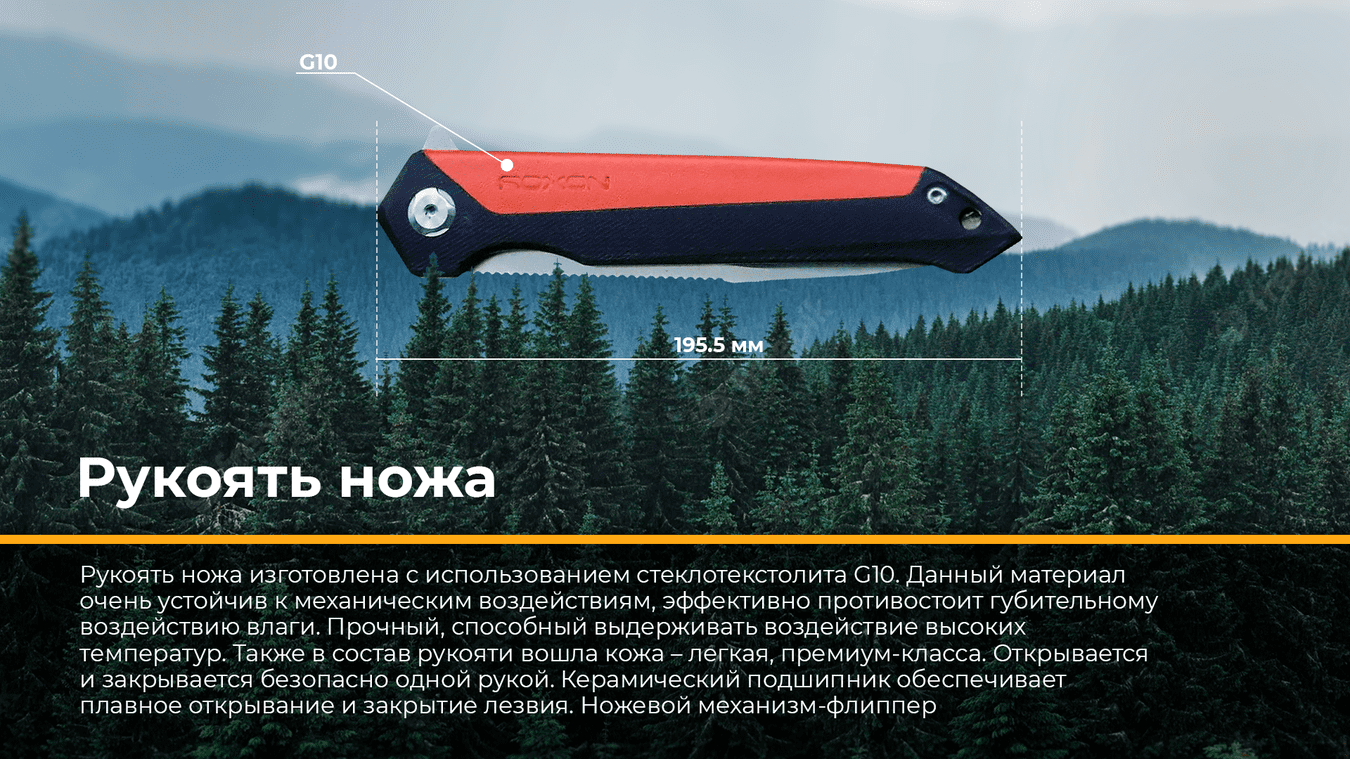 Рукоять ножа изготовлена с использованием стеклотекстолита G10. Данный материал является очень стойким к механическим воздействиям, эффективно противостоит губительному влиянию влаги. Он также хорошо поддаётся окрашиванию. Прочный, способен выдерживать влияние высоких температур. Также в состав рукояти вошла кожа – лёгкая, премиум-класса. Открывается и закрывается безопасно одной рукой. Керамический подшипник обеспечивает плавное открытие и закрытие лезвия. Ножевой механизм – флиппер.