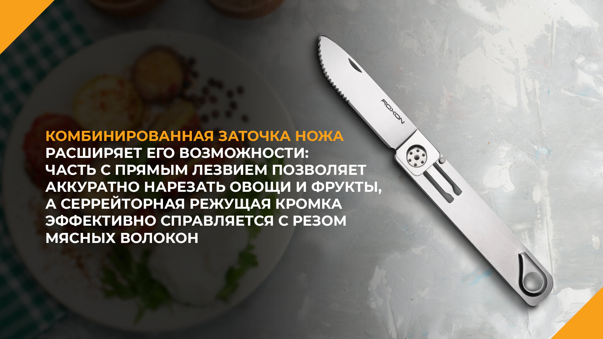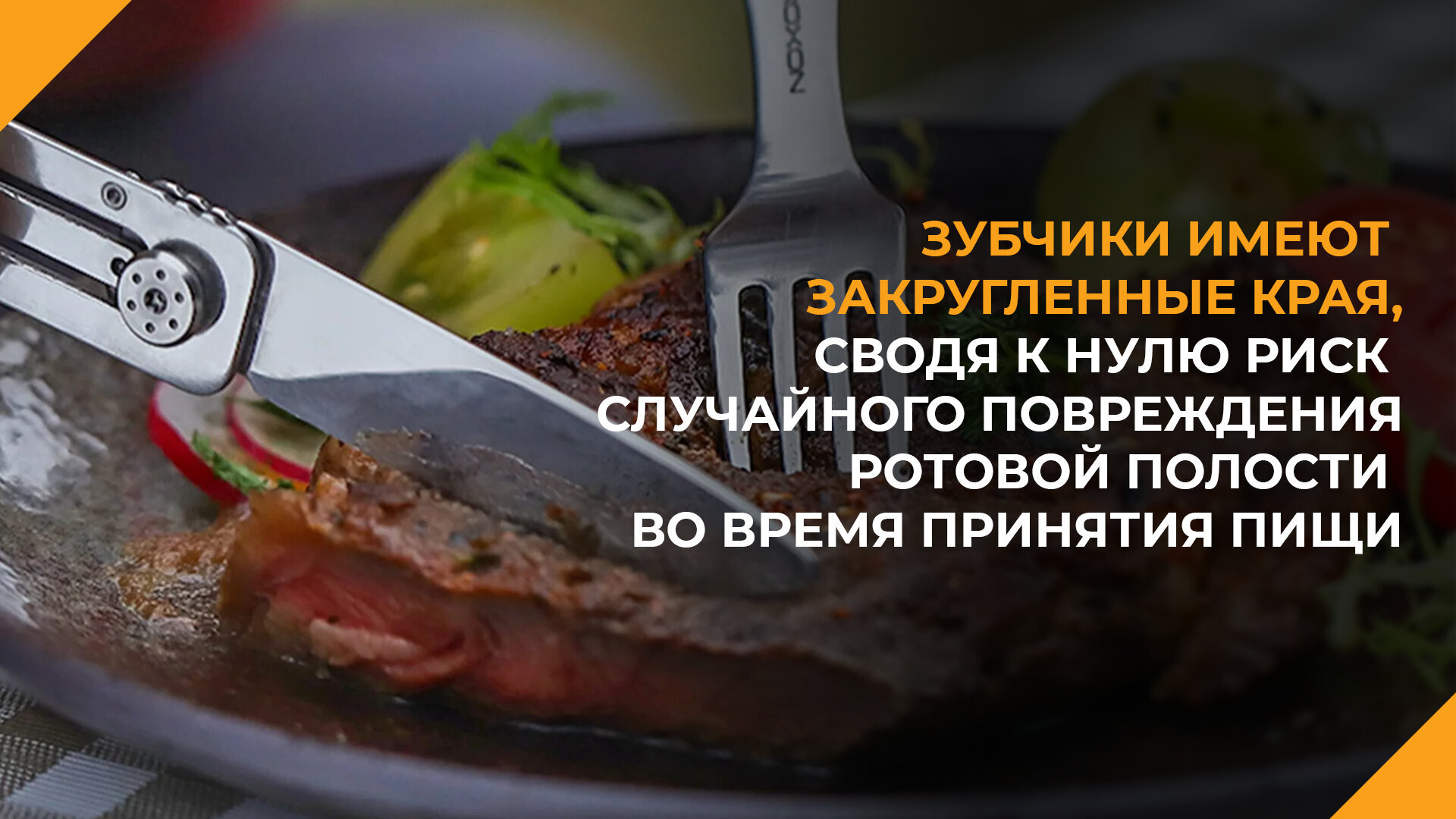 Ложка имеет закругленные края, как и зубчики вилки, сводя к нулю риск случайного повреждения ротовой полости во время принятия пищи. Комбинированная заточка ножа расширяет его возможности: часть с прямым лезвием позволяет аккуратно нарезать овощи и фрукты, а серрейторная режущая кромка эффективно справляется с резом мясных волокон.