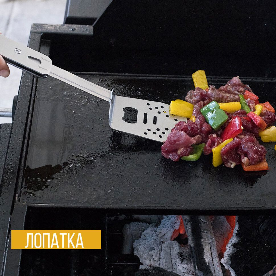 Его основные элементы – лопатка и вилка для переворачивания мяса или овощей на гриле. В дополнение к ним предусмотрены и другие функции.