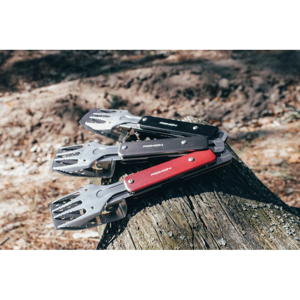 Модель Multi BBQ Tool MBT MINI S602 от бренда Roxon – это компактная версия мультиинструмента для приготовления барбекю. Он состоит из металлических лопатки и вилки, которые могут использоваться как самостоятельные инструменты, а вместе образуют удобные щипцы. Кроме того, в инструмент встроена простая открывалка для бутылок.